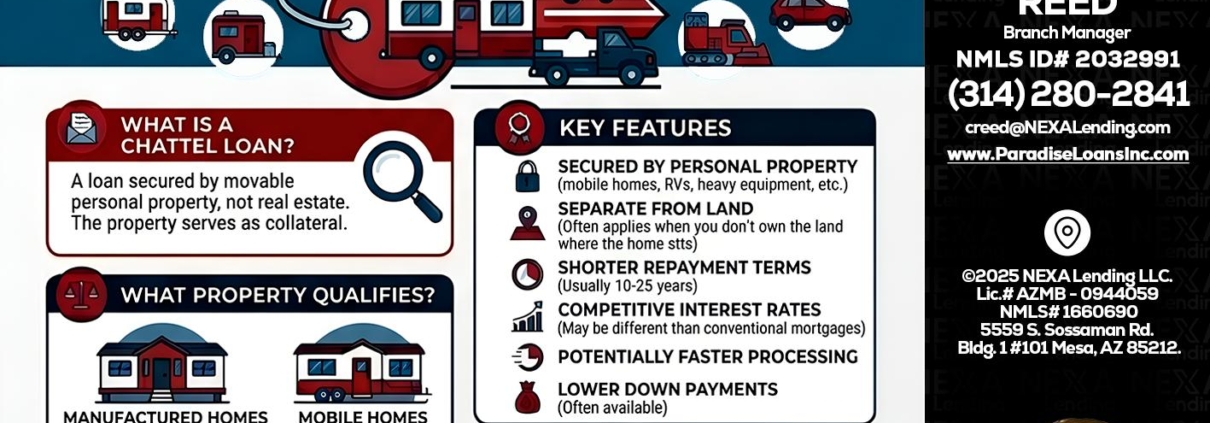 Chattel Loans - Christopher Reed -Branch ManagerHi, my name is Christopher Reed. I’m a Loan Officer offering personalized mortgage solutions, fast customized quotes, great rates and service with integrity. If you’re interested in learning more about the Chattel loan or any other, just let me know and I’ll walk you through your options.